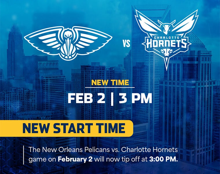 The NBA announced today the start time for the Charlotte Hornets game against the New Orleans Pelicans at Spectrum Center on Monday, Feb. 2 has been changed to 3 p.m. due to the weather conditions in the Charlotte region. -